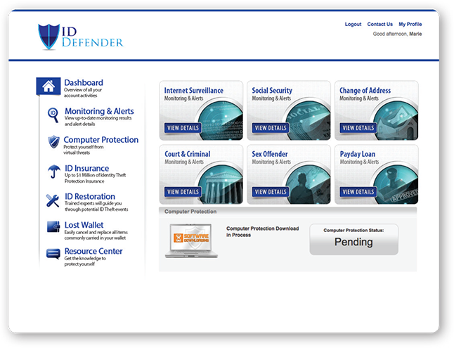 Defender Plus leverages cutting-edge technology, monitoring thousands of data sources to alert you of any potentially fraudulent activity associated with your personal information. We have developed a 360-degree approach to Identity Theft Protection – Protection, Detection, Restoration – to give you the most complete coverage available. |